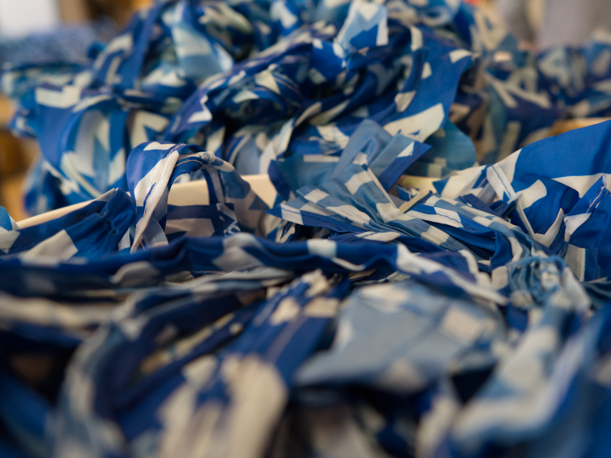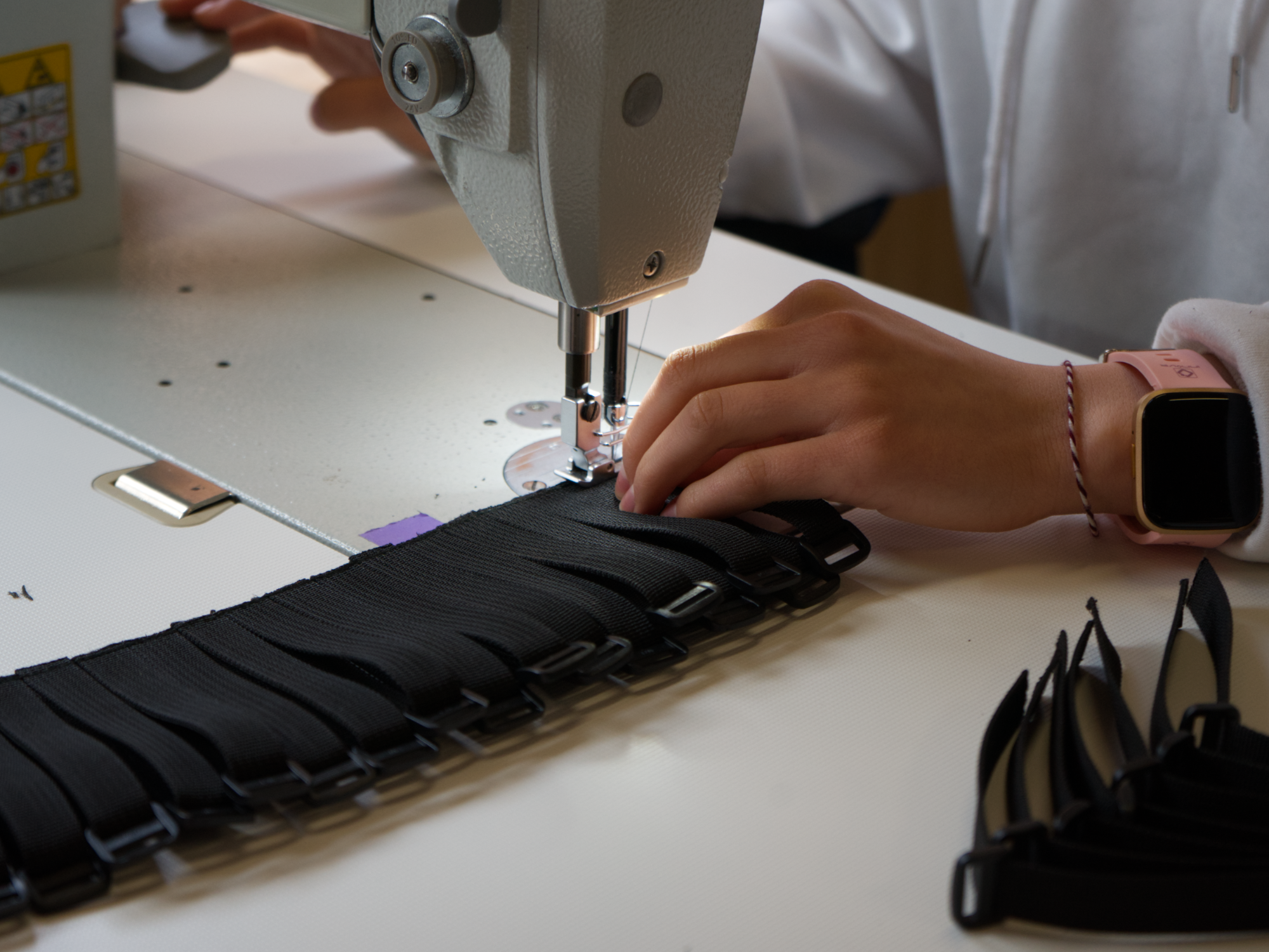 De kleding wordt bijna volledig gemaakt van de tasjes. We knippen grote vlakken uit, stikken de boord, zetten er een rits in en tada: je nieuwe (upcyclede) fashion statement!