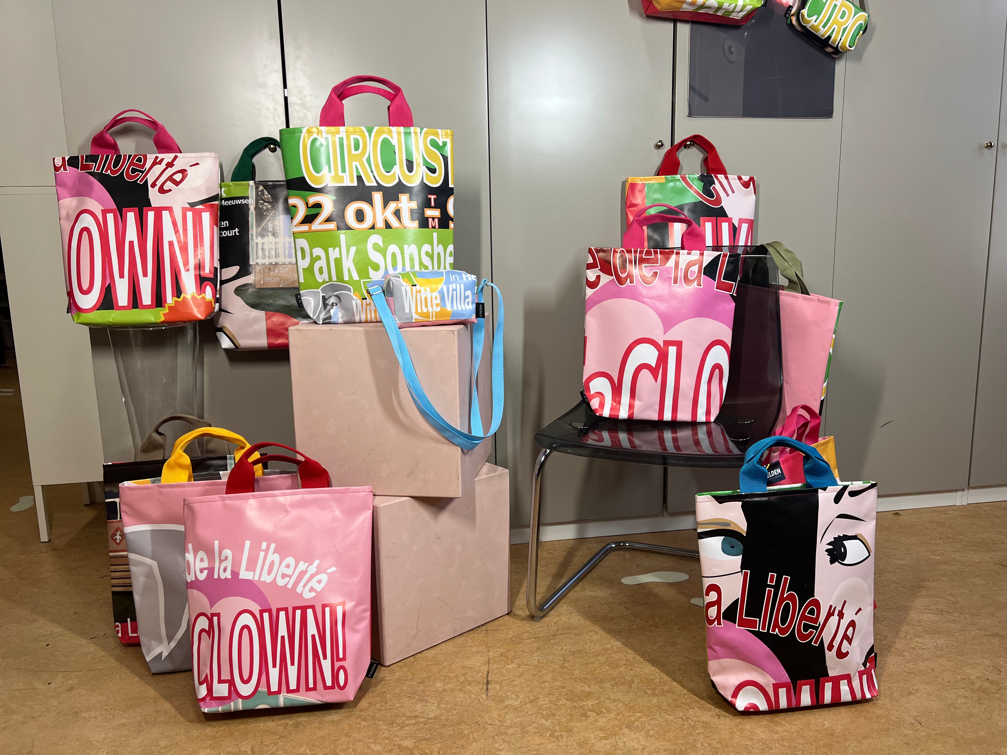 Voor Cirque de la Liberté kregen wij bij Fraenck de bijzondere kans om oude banners een tweede leven te geven. Van kleurrijke circusbanners creëerden we een unieke, duurzame collectie vol karakter, energie en verhaal.