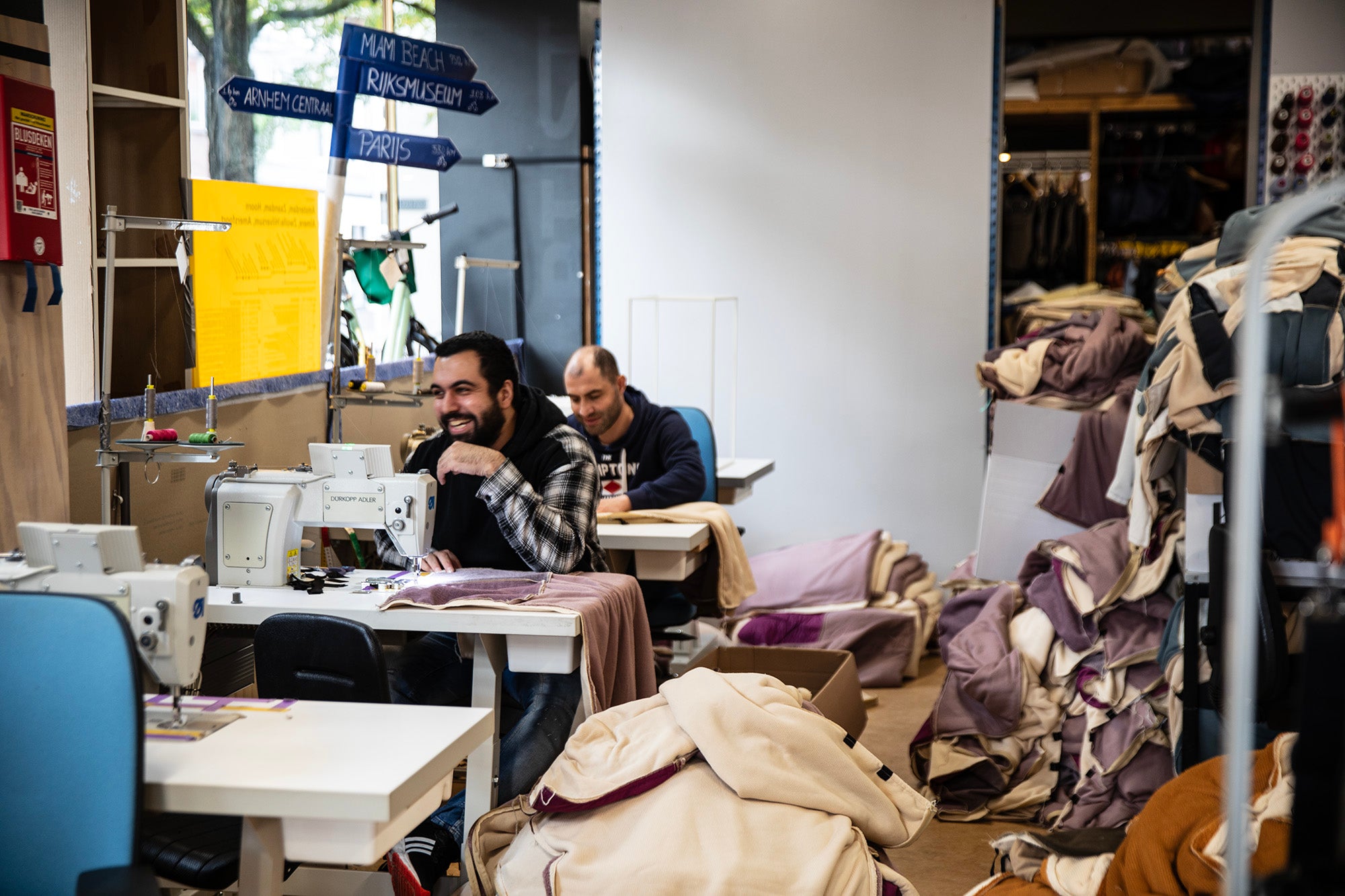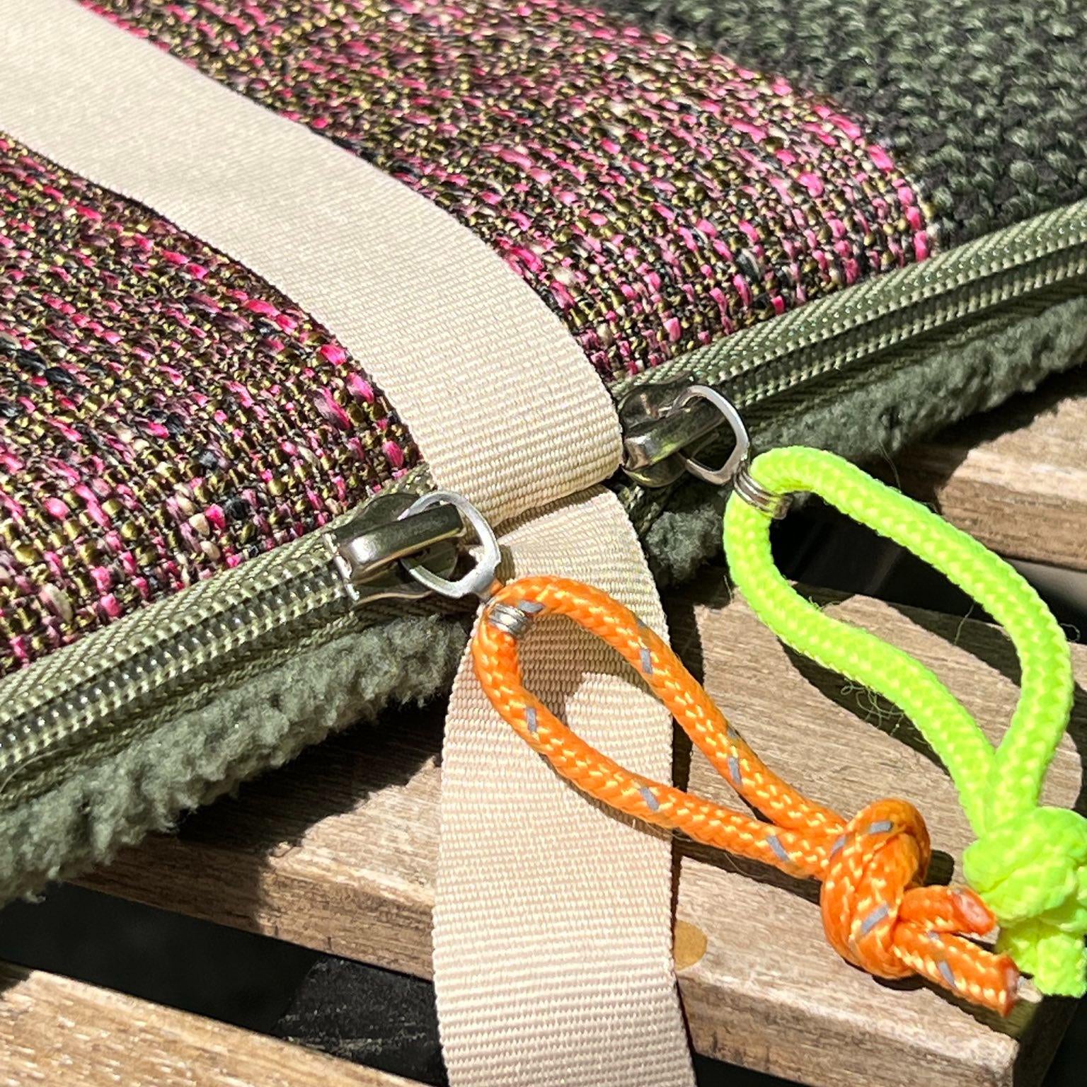 De pullers van de ritsen zijn gemaakt van oude scheerlijnen van tenten. Een duurzaam, kleurrijk en onderscheidend detail!