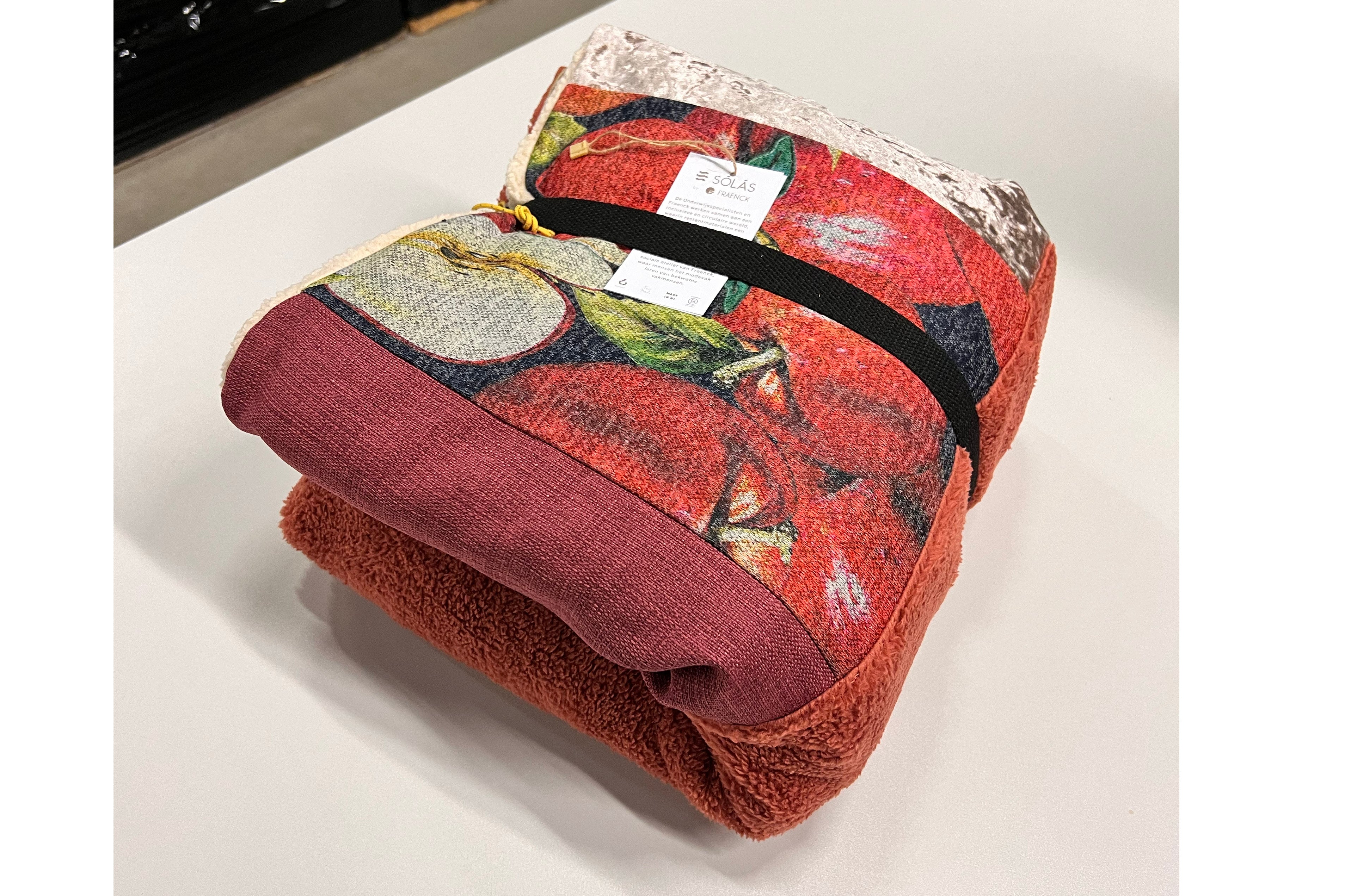 Eén zijde van de deken is voor een deel een patchwork van leftover stoffen. Mooi detail en het communiceert dat we ook met dit project duurzaamheid hoog in het vaandel hebben ♻️