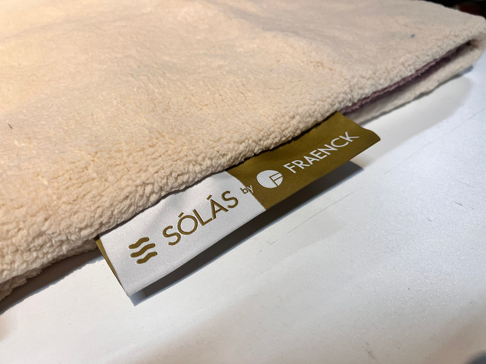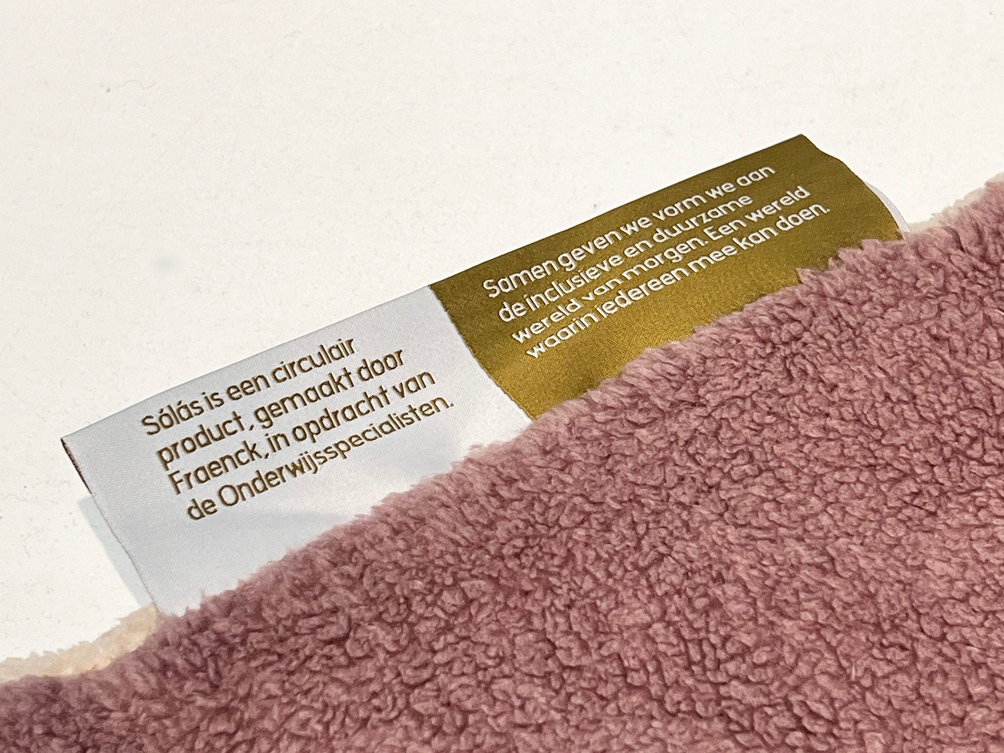 Het geweven label in de zijnaad van de deken. Ene zijde de product/ merknaam.