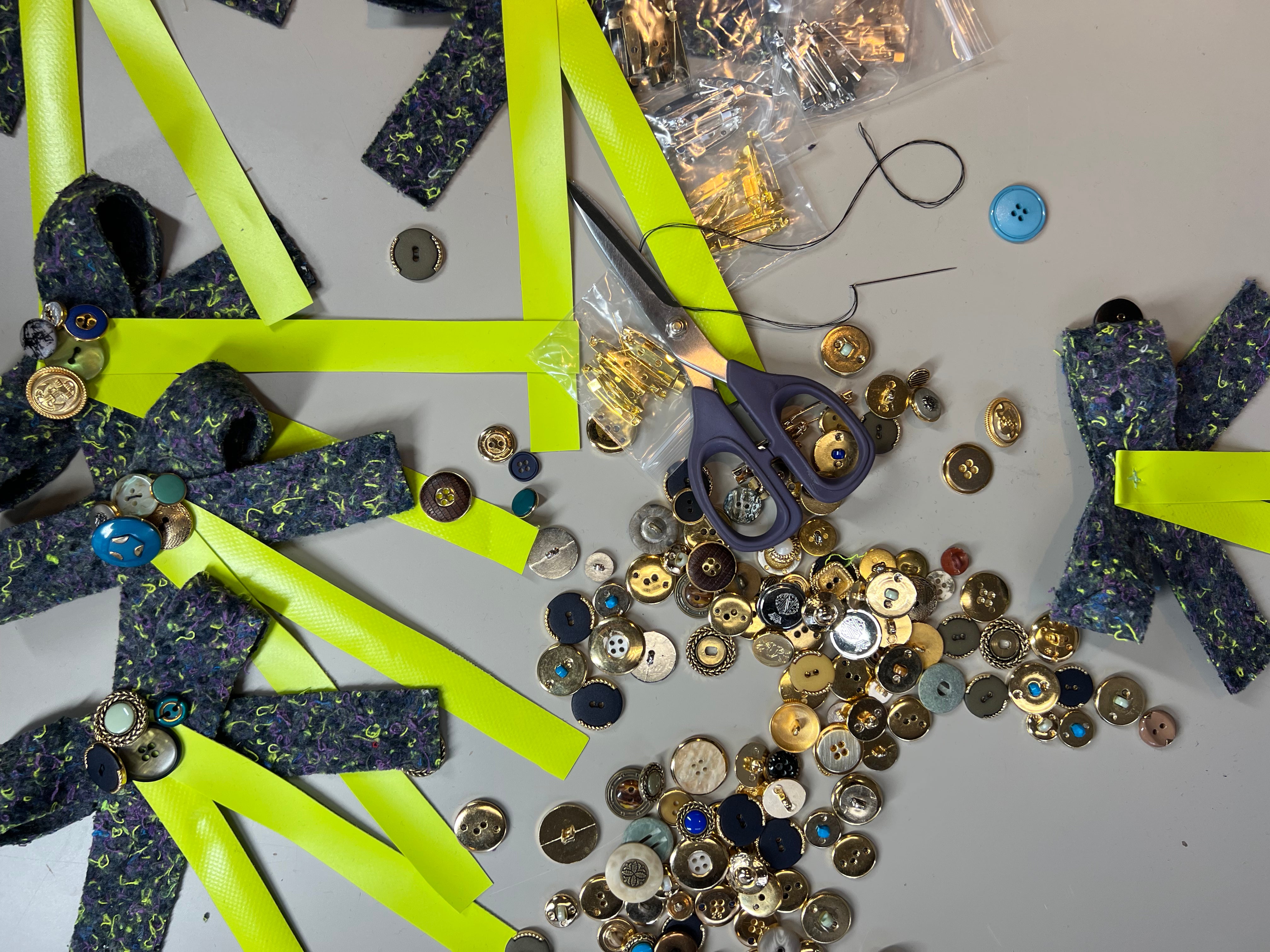 Materiaal: Resttextiel, vilt uit oude bedrijfskleding, zeildoek, vintage knopen