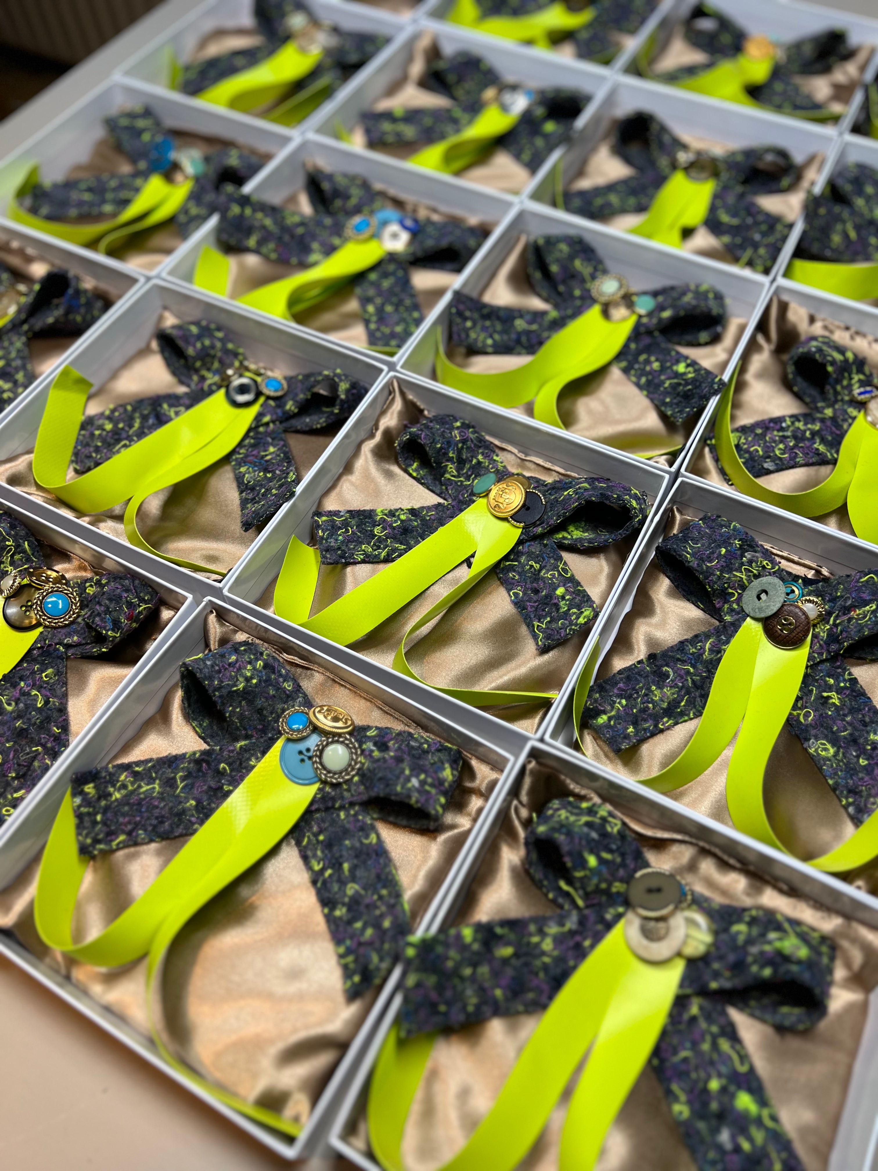 Het resultaat: een unieke broche, gemaakt van gerecycled materiaal, zoals vilt uit oude bedrijfskleding, restant zeildoek en knopen die jarenlang zorgvuldig bewaard waren. Elk element kreeg zo een tweede leven, passend bij het verhaal van duurzaamheid en lokale betrokkenheid. De broche werd gepresenteerd in een speciaal doosje met een gouden kussentje, waardoor het een waardevol en gekoesterd object werd. Ook dat doosje was onderdeel van het hele ontwerpproces.