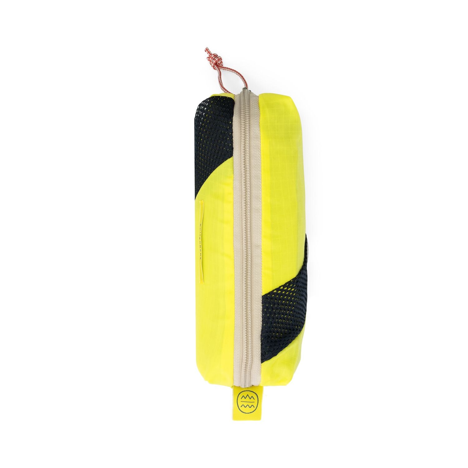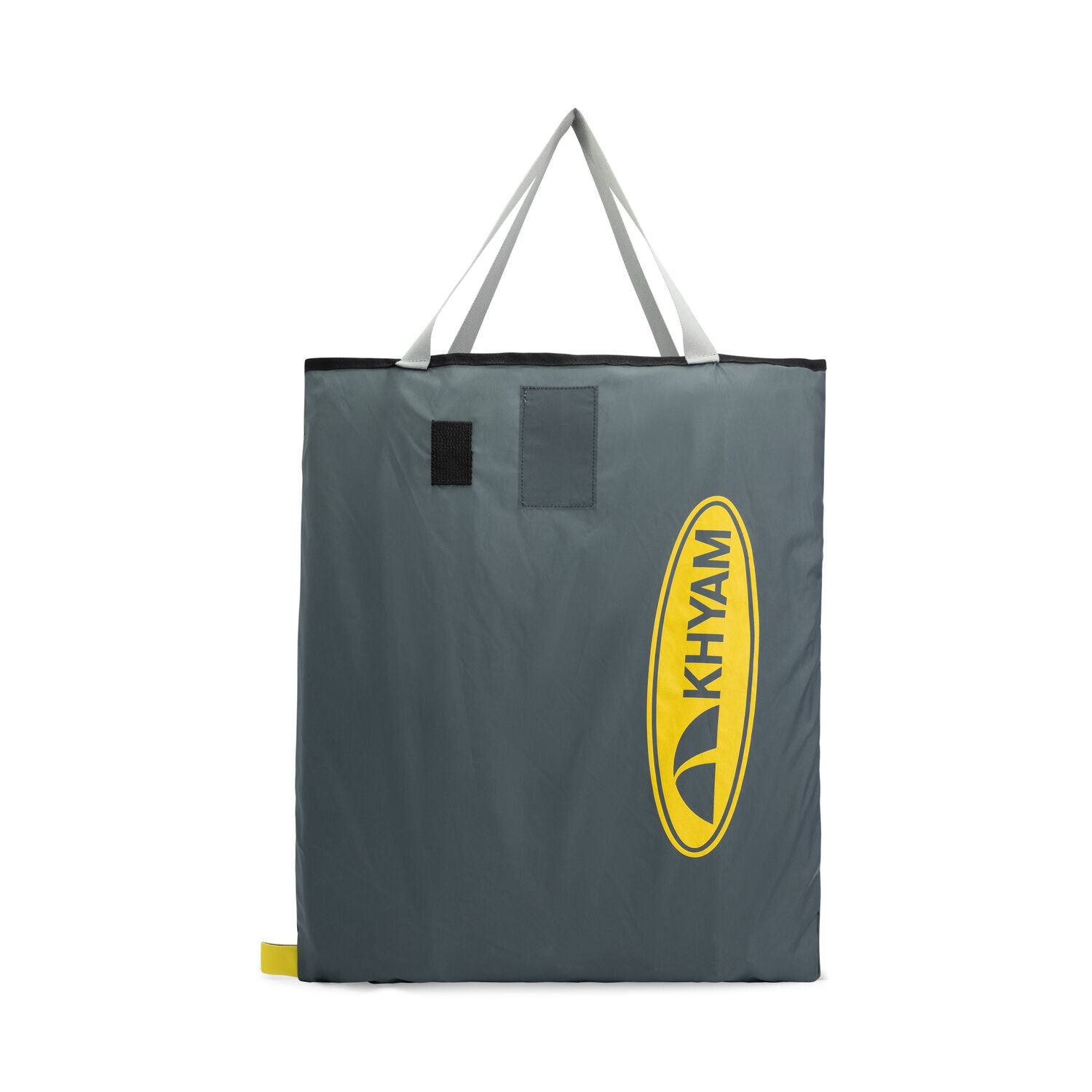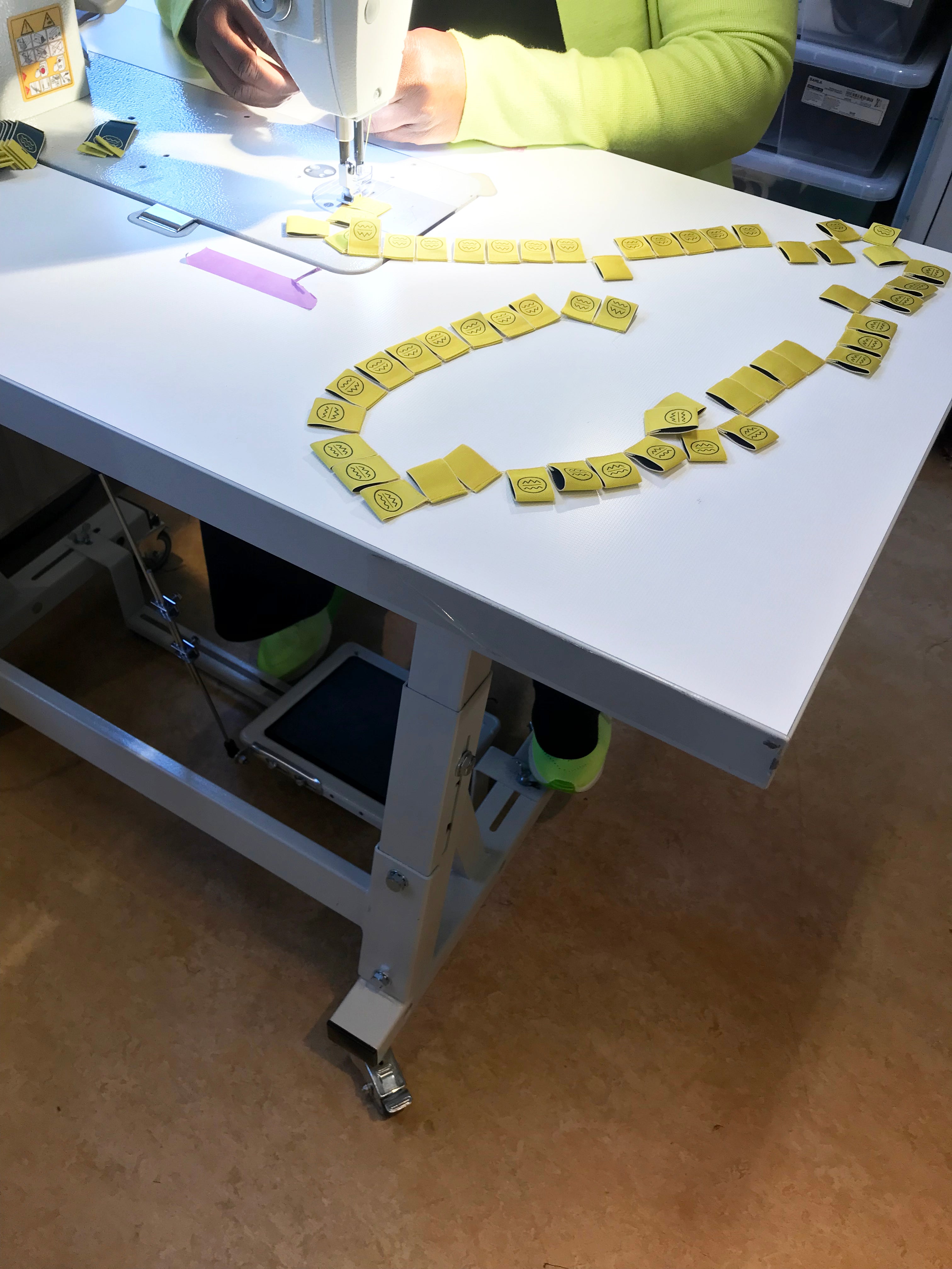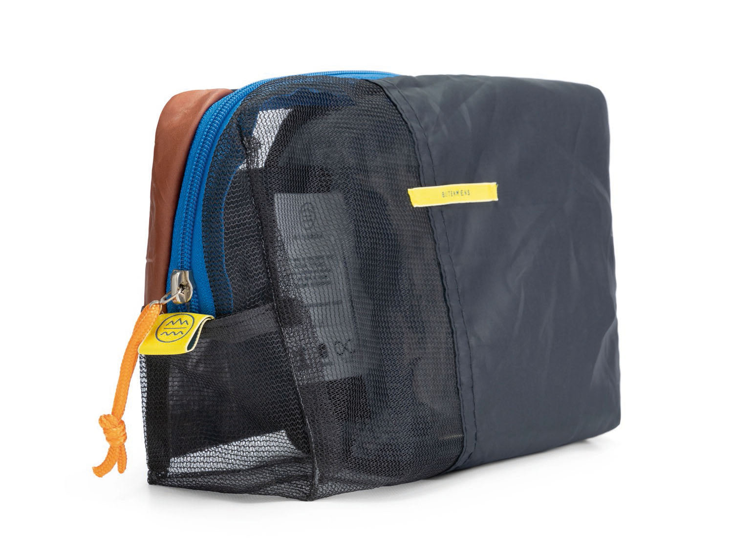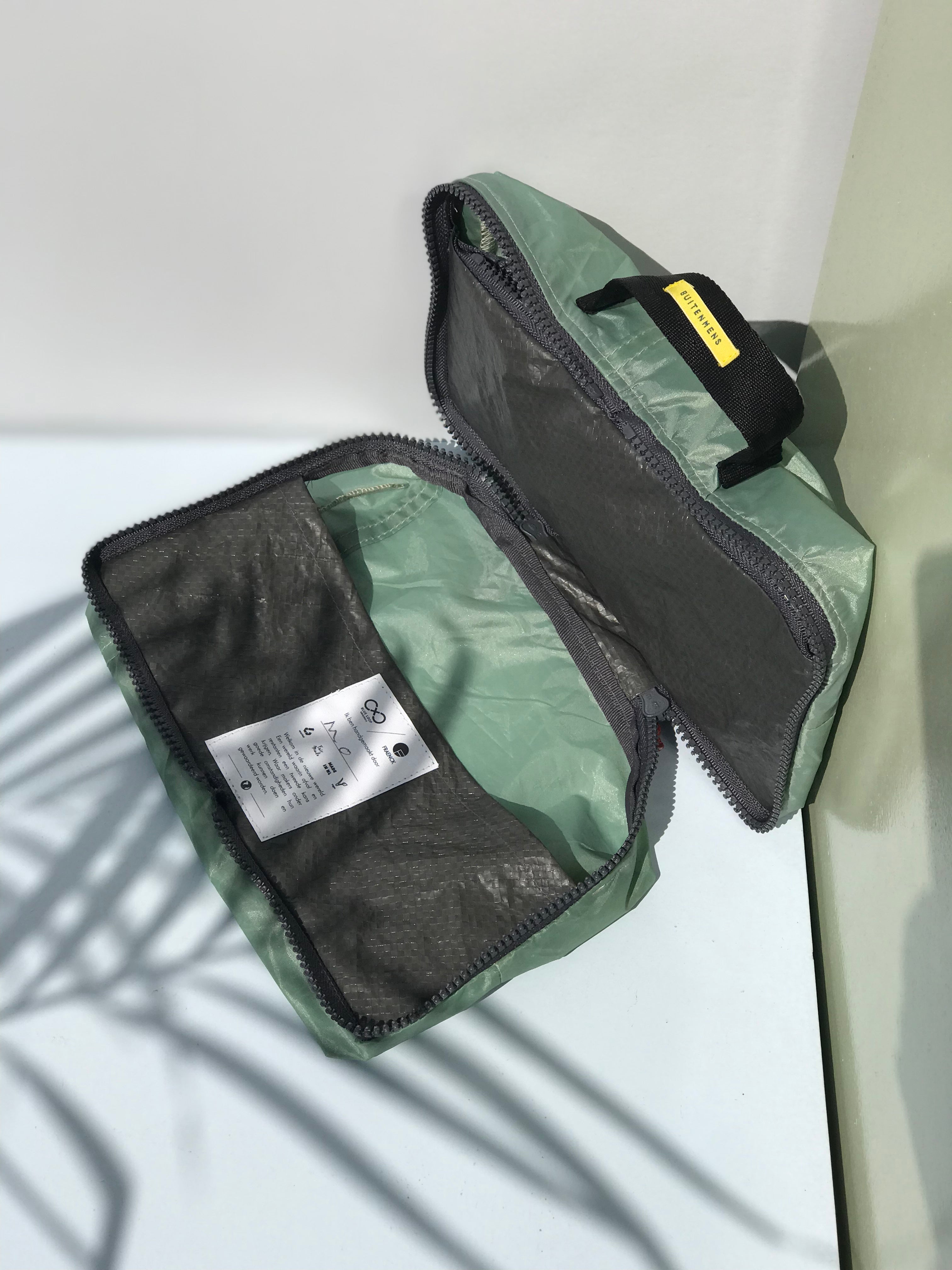 En wat zijn we trots op de collectie! De basis van alle producten zijn de ingezamelde tenten, waarvan we zoveel mogelijk inzetten. Zoals bij deze toilettas, die voor 95% bestaat uit tentdoek en gronddoek. Op elk item is een label gestikt met het bijzondere verhaal achter het product, met daaronder de handgeschreven naam van de maker.
