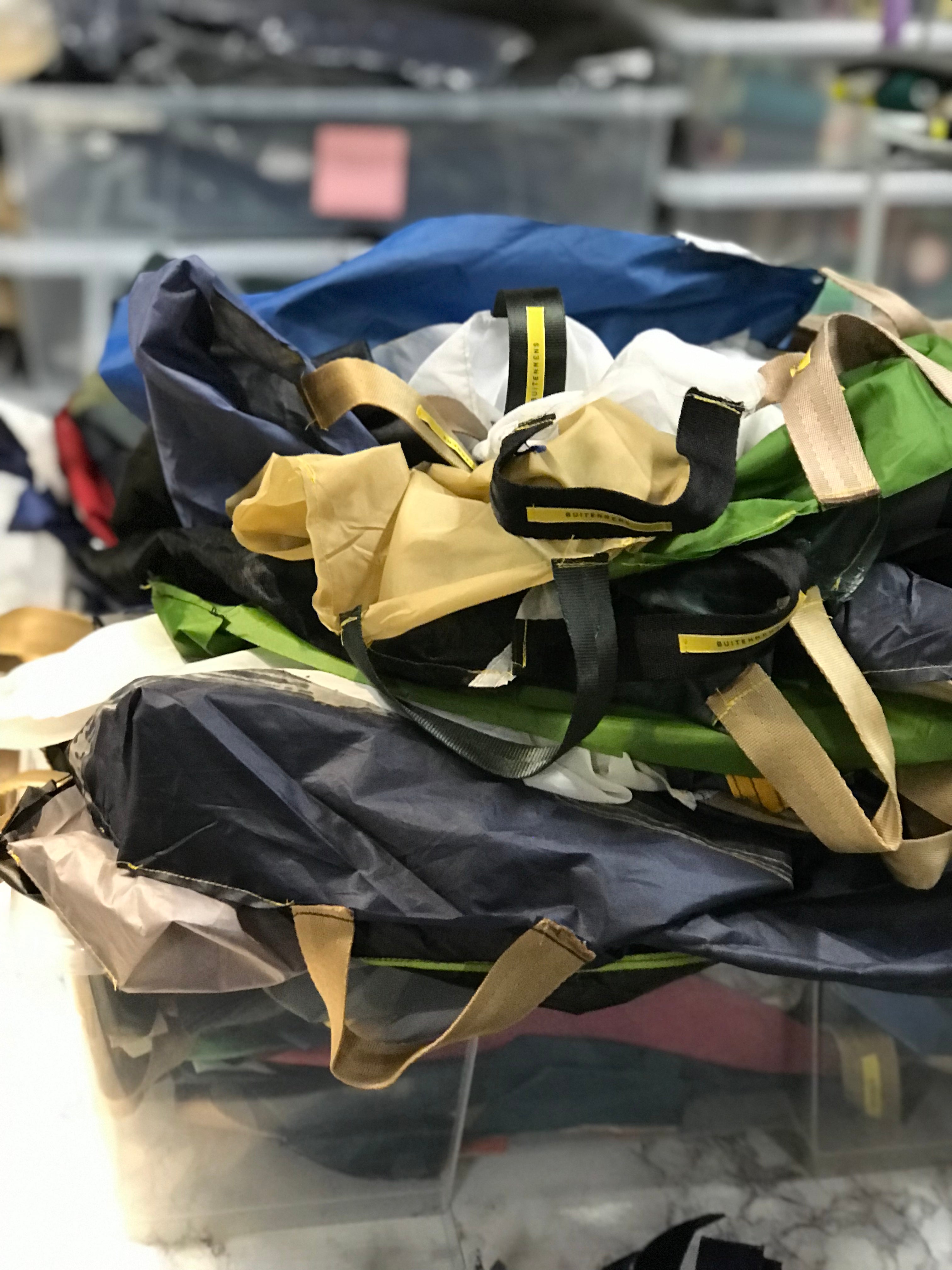 De tenten van Bever zijn gemaakt van hoogwaardige materialen. Als ze binnenkomen bij het inzamelpunt, wordt er eerst gekeken of de tent met een reparatie weer verder kan. Maar soms is het leven als tent niet meer rendabel. Gelukkig zijn er nog een boel onderdelen die we wél een tweede leven kunnen geven.