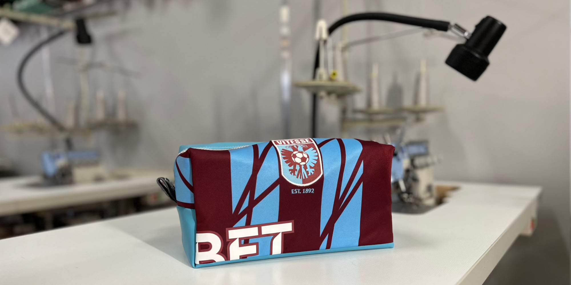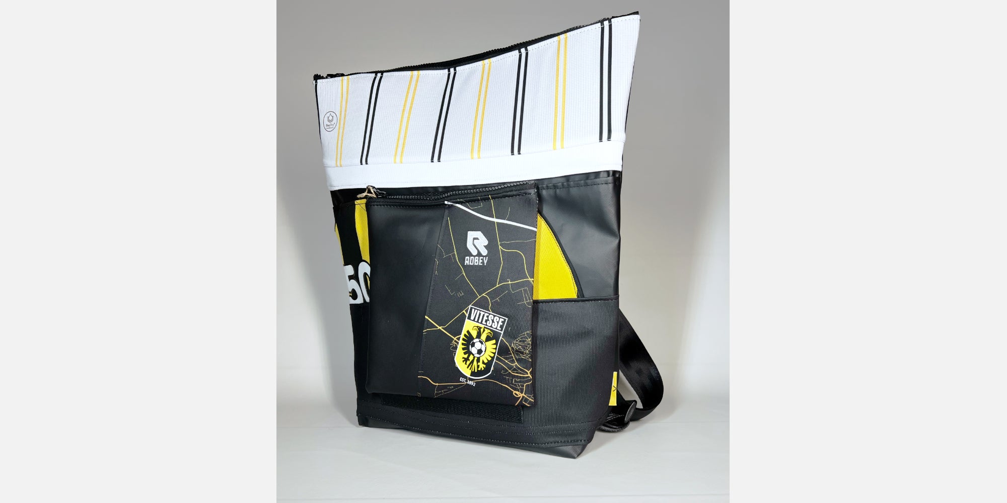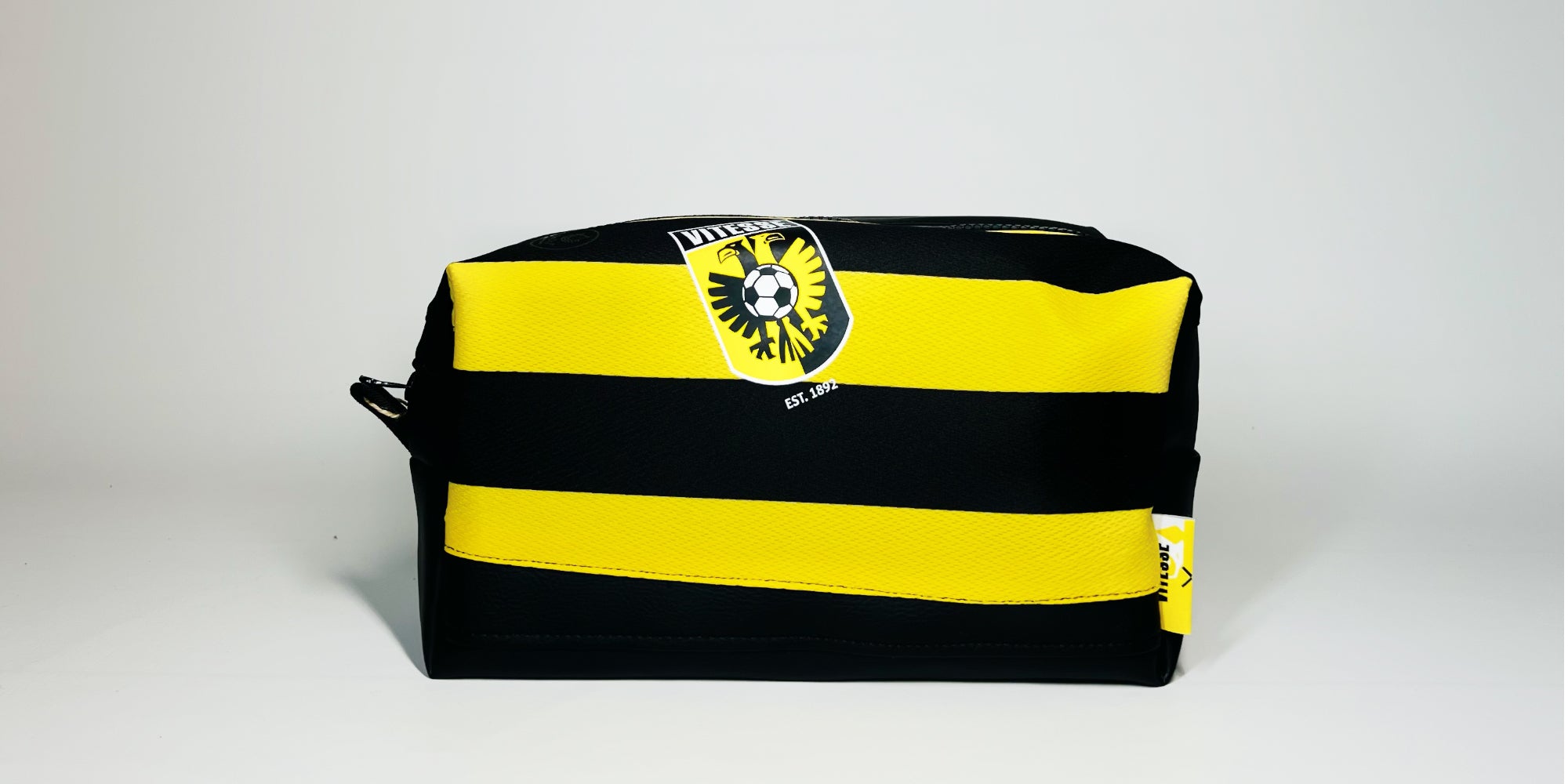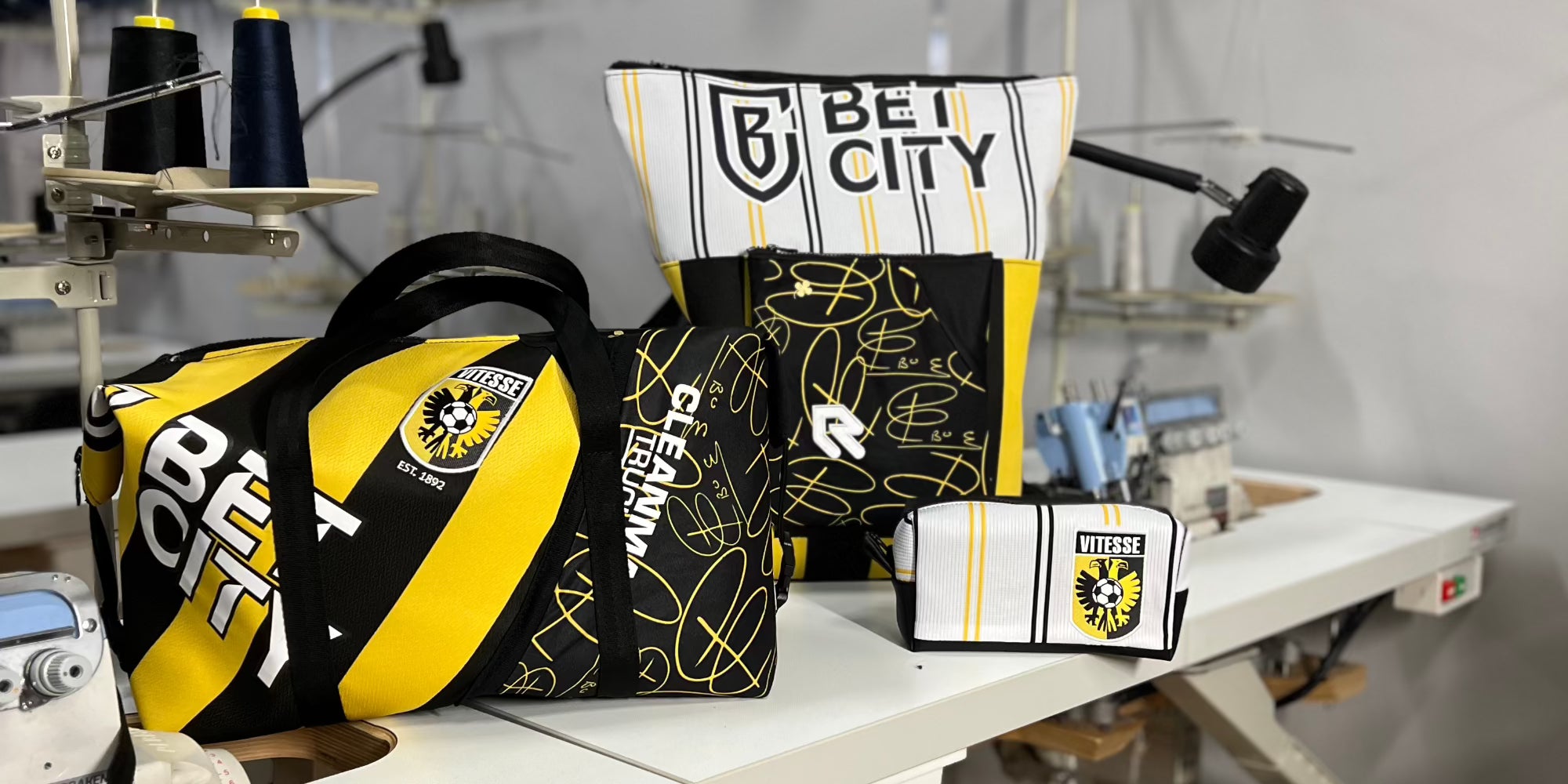 Met de prachtige designs van de Vitesse-shirts zijn we aan de slag gegaan. Hoe konden we dit al bestaande ontwerp het best tot z'n kracht laten komen? We zijn uitgekomen op een (al zeggen we het zelf) heel gave lijn tassen!