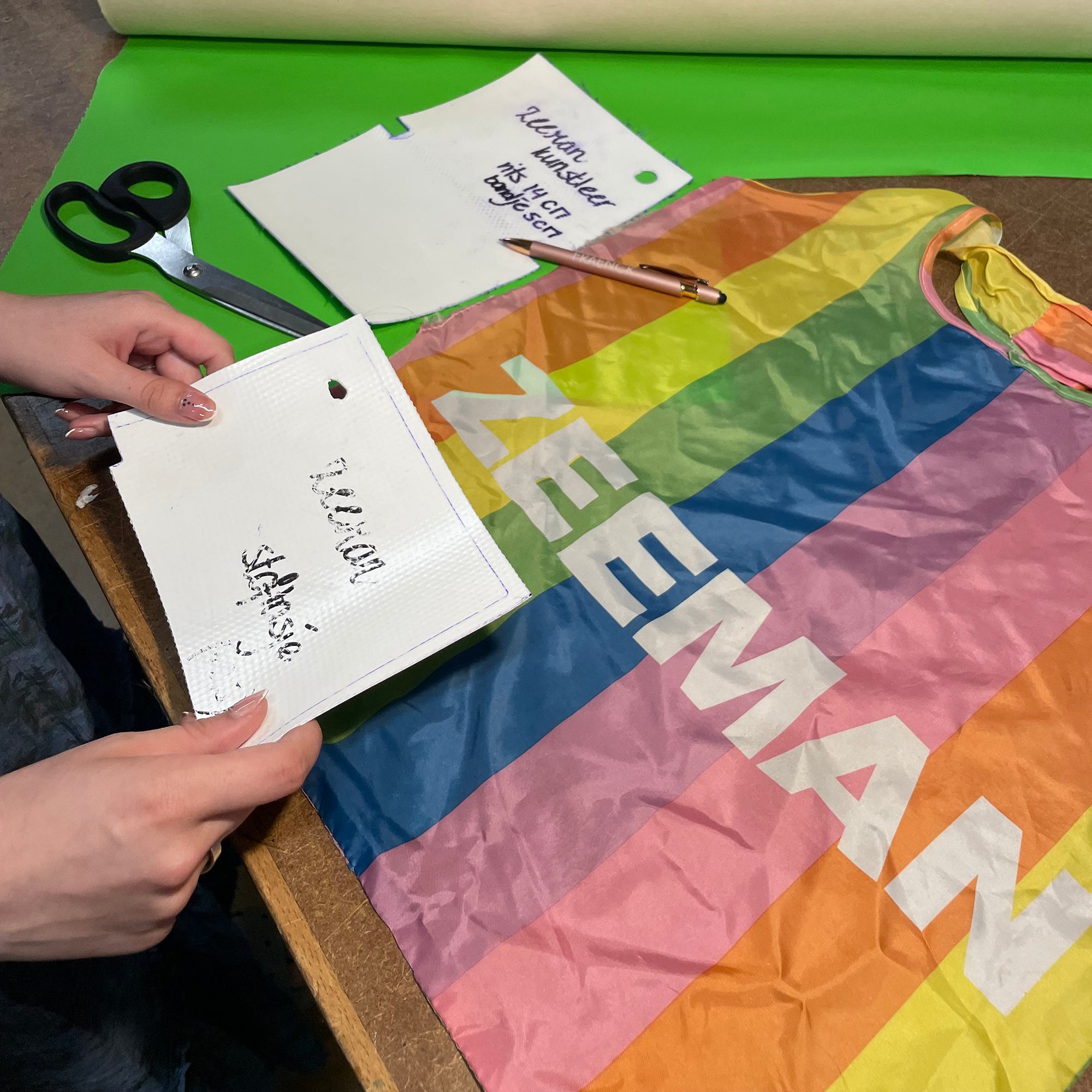 Met deze tasjes als ingrediënt zijn we aan de slag gegaan. Voor de tasjes kunnen we deze keer putten uit een breed scala aan dessins. Bij de kleding is gekozen voor twee specifieke dessins tasjes, vanwege de grote hoeveelheid hiervan, in combinatie dat het online verkocht gaat worden. We maken een paar snelle schetsen en gaan aan de slag met patronen.