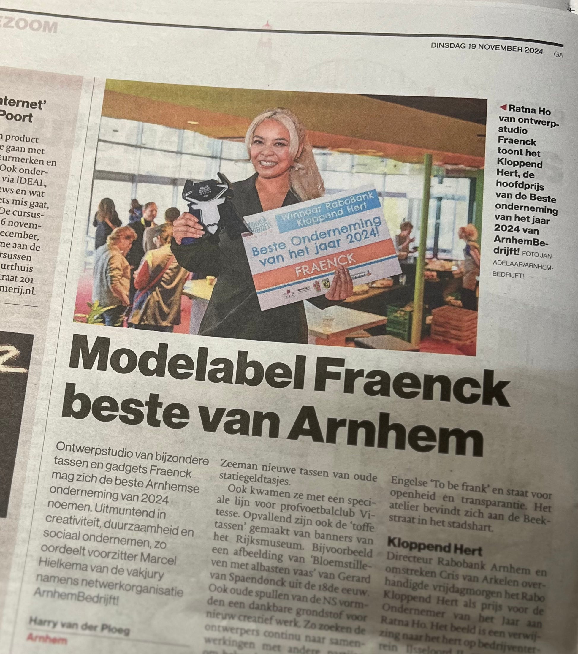 Waar andere speelgoed hadden was de kamer van Ratna gevuld met stoffen. Haar moeder werkte in de mode-industrie en leerde haar de fijne kneepjes van het vak. Ruim 25 jaar geleden is ze begonnen met tassen maken van reststoffen, van de producties van haar moeder, is het nu de kern geworden van Fraenck.